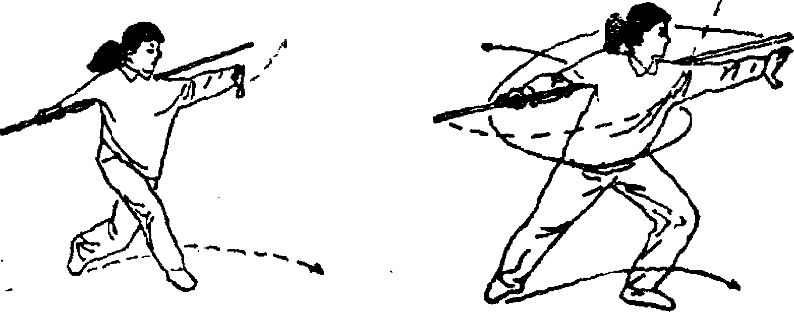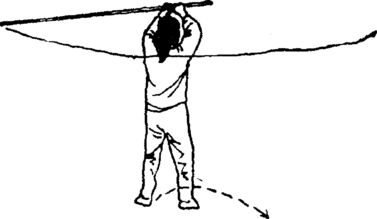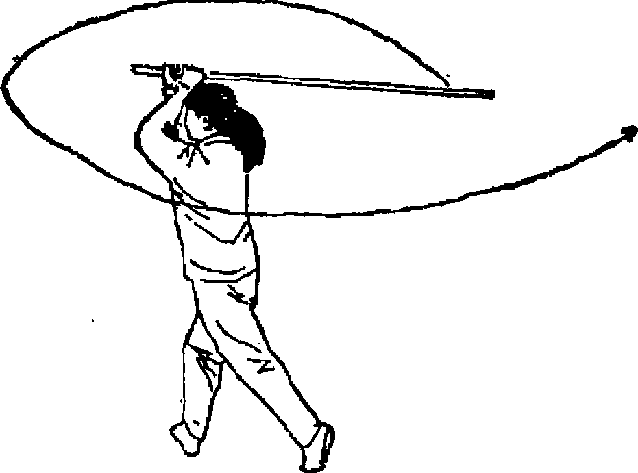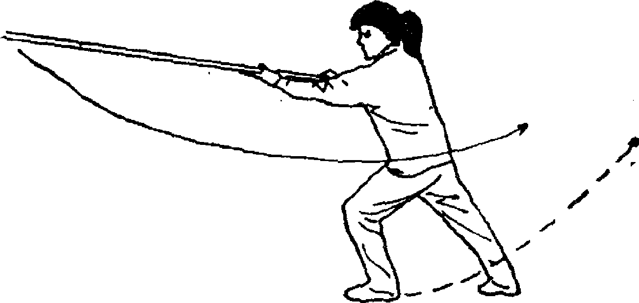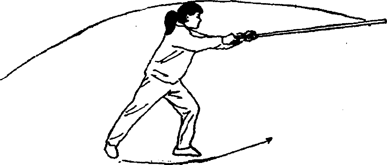 7. 身体左转180。,重心前移,右腿伸直脚跟抬起;同 时双手持棍向左平抡;目视棍梢前方(图41)。