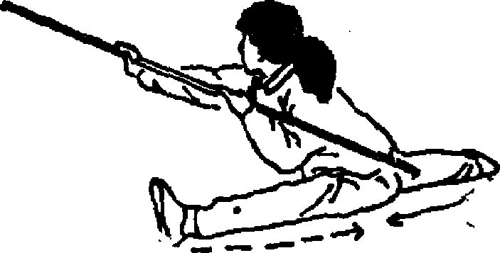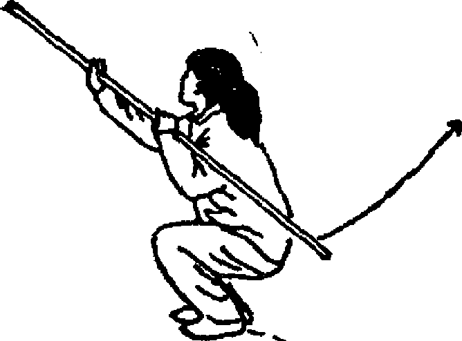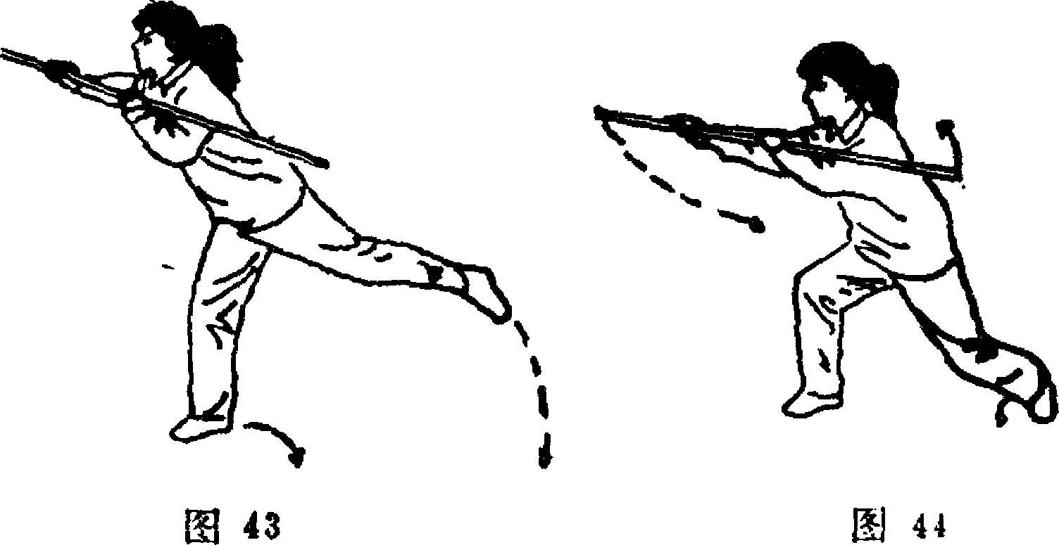 1. 重心后移,右腿微屈支撑,脚跟稍离地.左腿向后 撩起,高于膝3双手持棍向左斜后方平摆,然后右手前推棍. 把,屈左肘将棍收于左上臂外侧,上体前俯;目视前方(图. 43)?