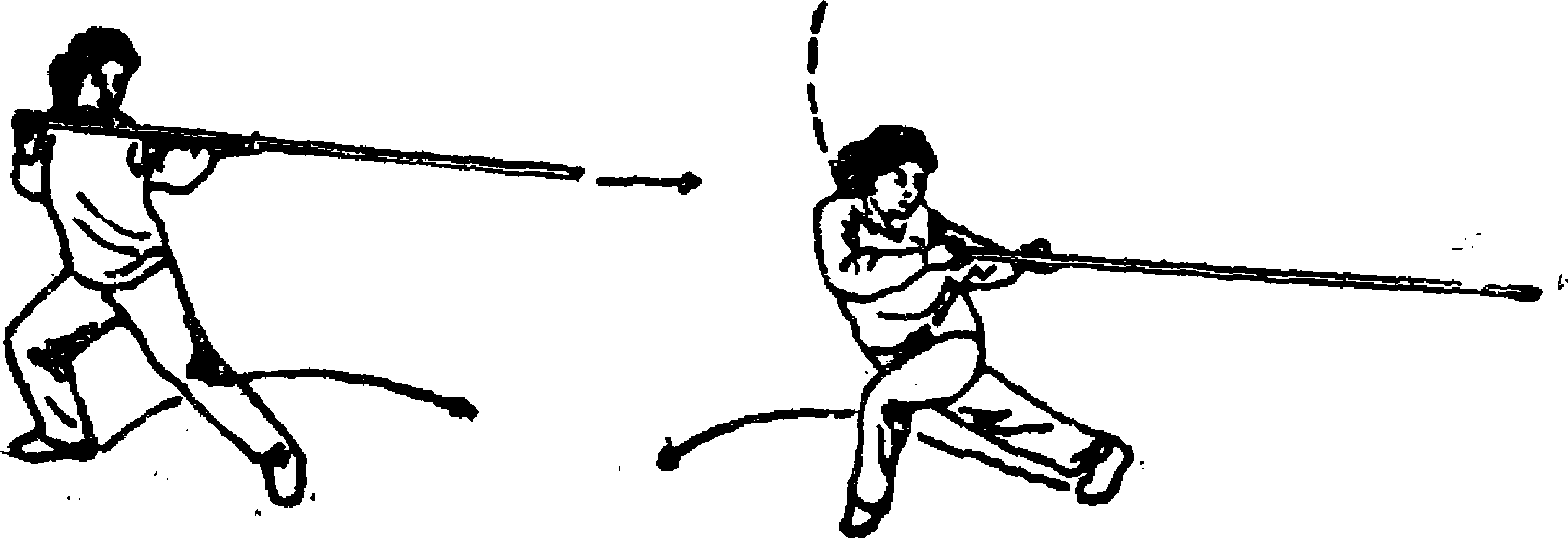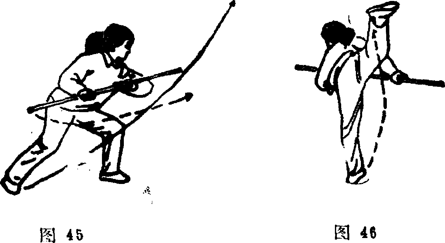 3- 上体向左拧转,重心移至左腿,右脚蹬地脚跟微离 地;双手持棍,右手稍用力前推棍把;目视左前方(图45)。