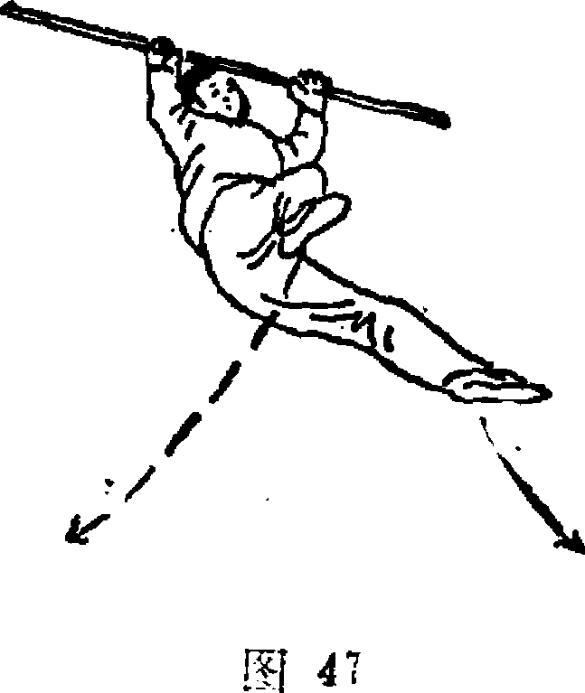 5.左腿向后上方摆起, 站靠右腿;同时身体在空中向 左迅速做水平旋转180";双手 屈肘将棍抱于胸前;向左转 头,目视左前方地面(图47)