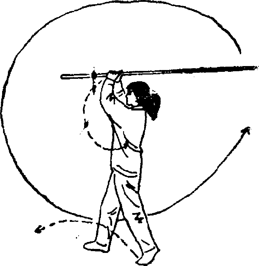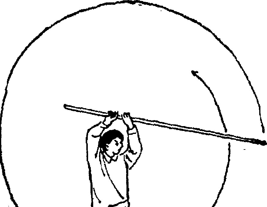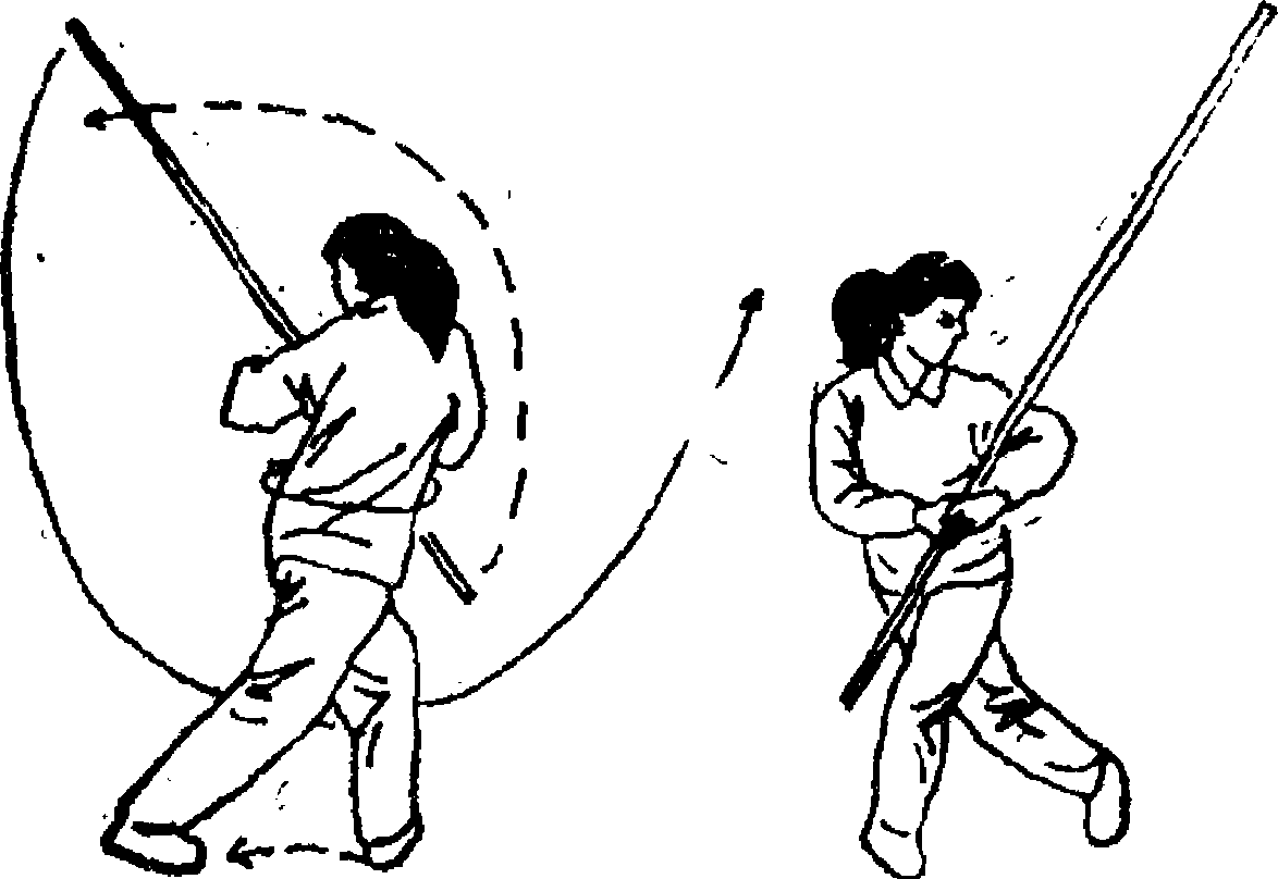 势臂内旋将棍梢经上向前、向下、向后摆出,棍前端收于 右腋下.稍低于棍把;目视前方(图93)0