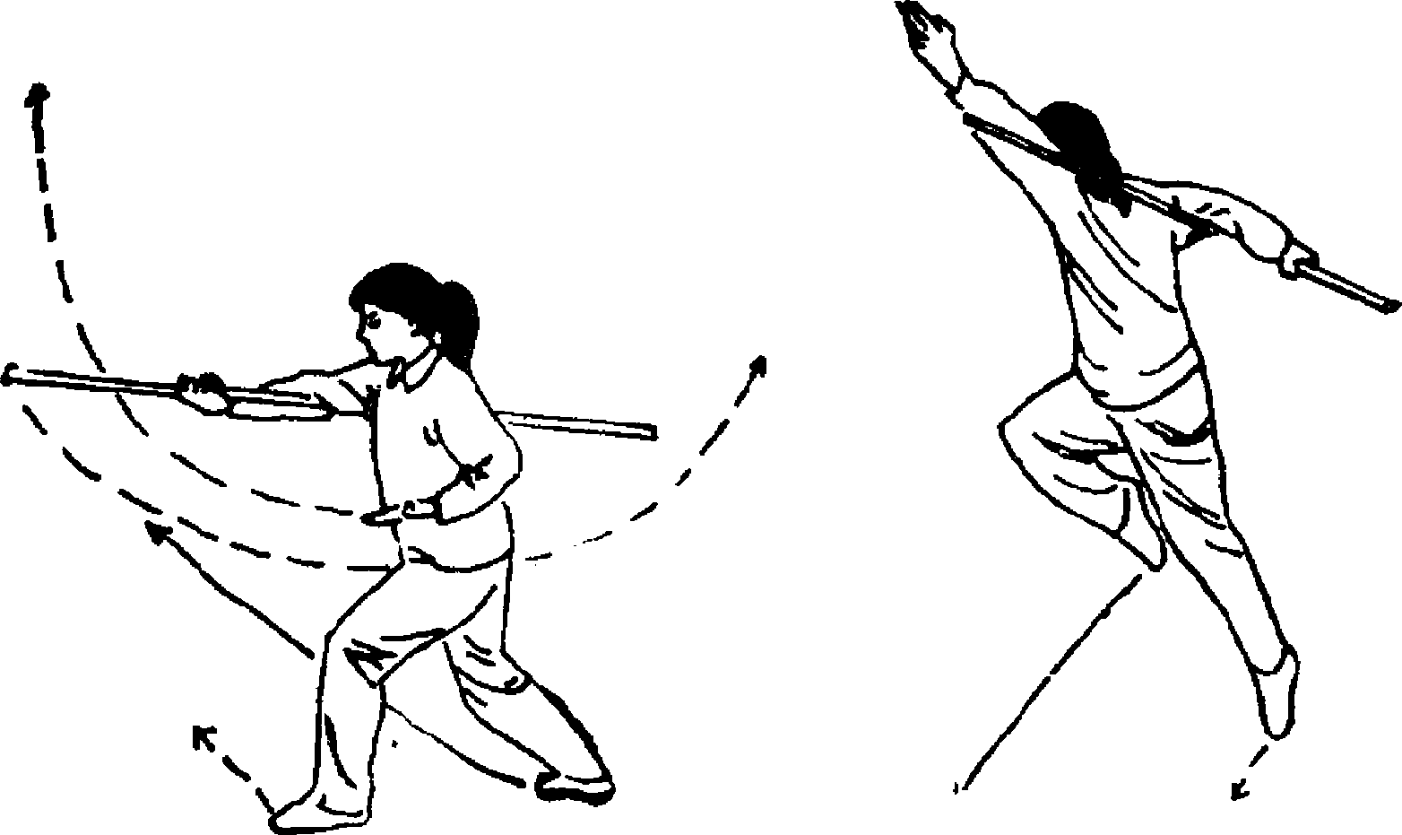 1.右脚向左斜后方落步,前脚掌着地,两腿微屈;和 手将棍把带至右斜下方,双手置于左腹前,棍梢随之向左摆. 出.高于棍把,上体稍向空拧转;目视左前方〔图90及反面图