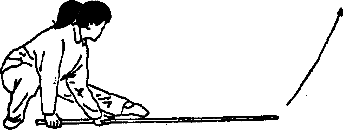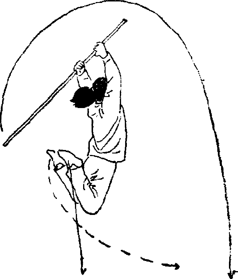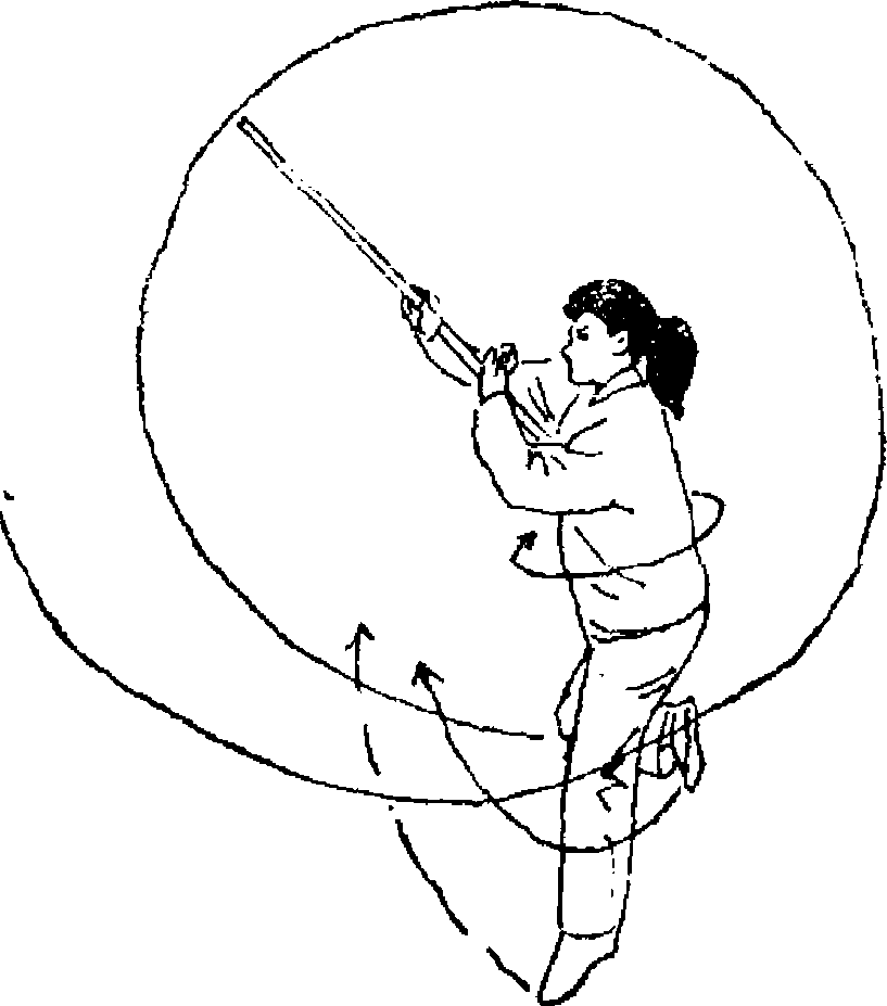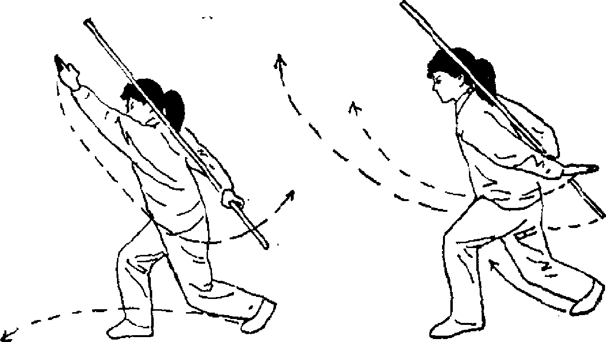 将棍把向下、向前上方摆出.左手前摆屈肘附于棍身;目视 前方(图97)#