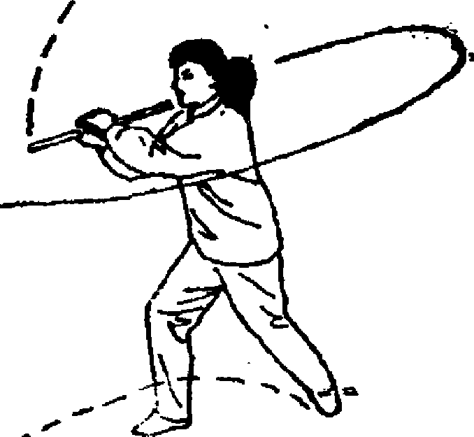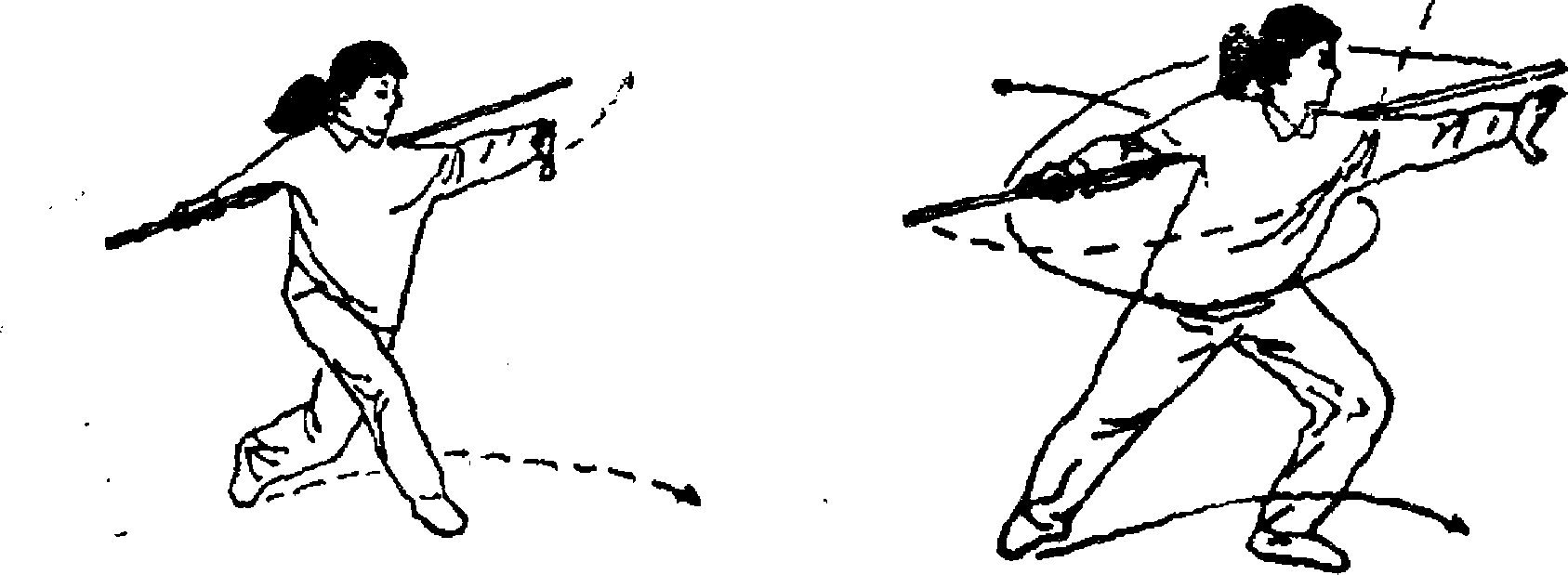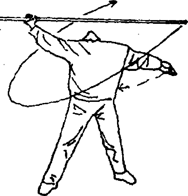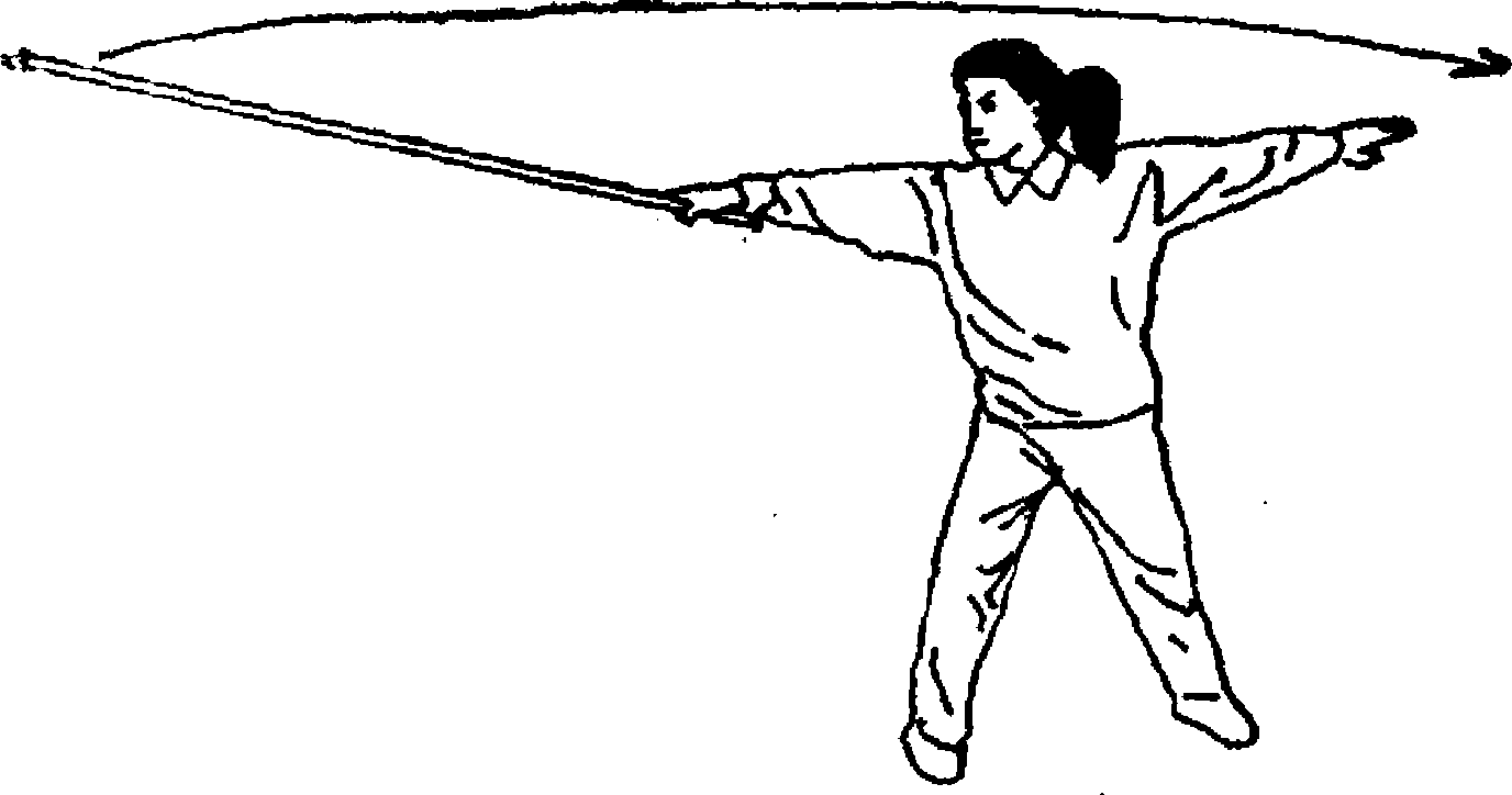 7,身体左转180°,重心前移?右腿伸直脚跟抬起;同 射双手持棍向左平抡;目视棍梢前方(图0