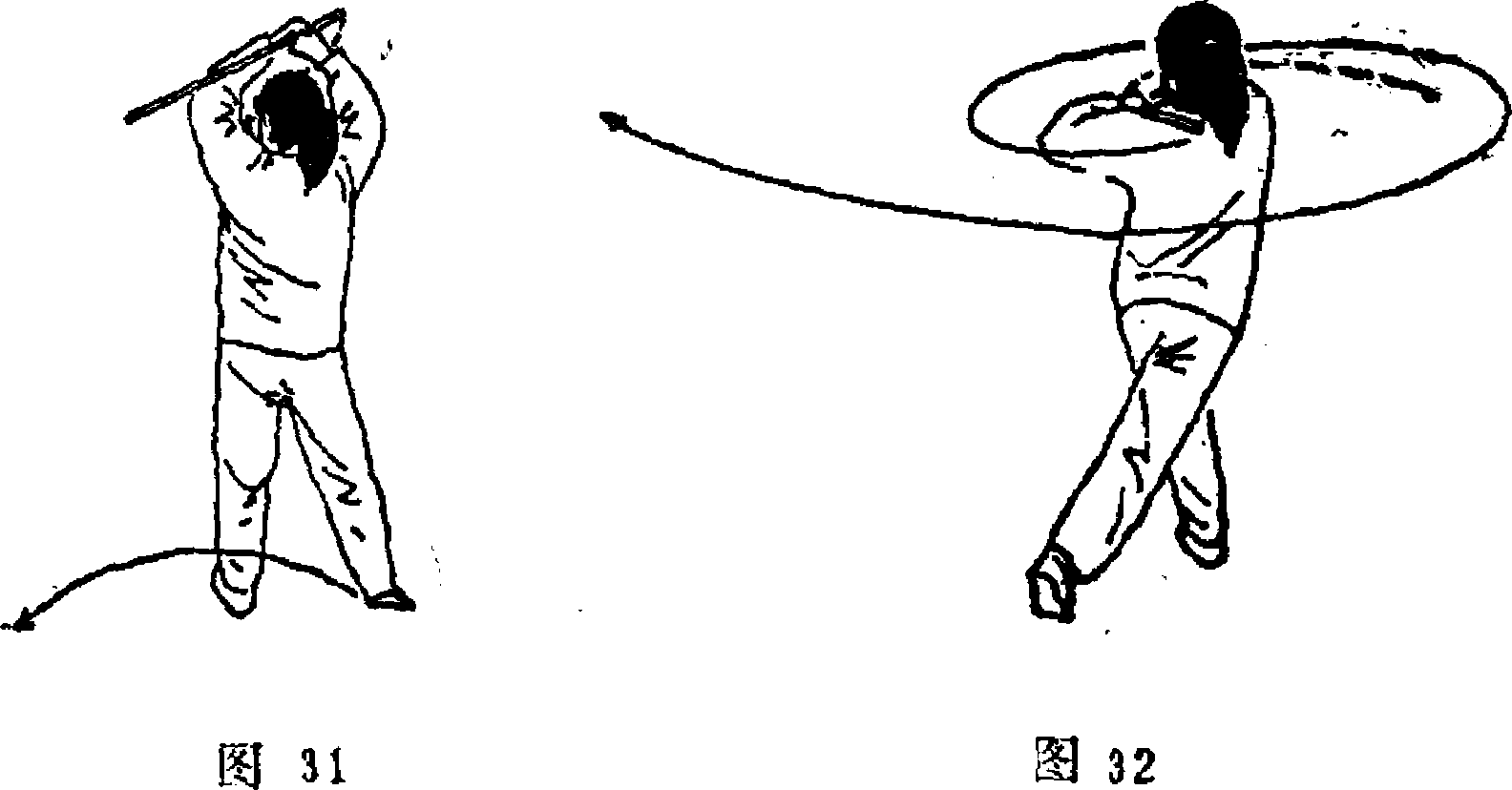 心左移,右腿伸直脚跟抬起;双手持棍继续向右、向后摆出 并随摆棍将棍把上举头顶前上方;目视前方(图31)。