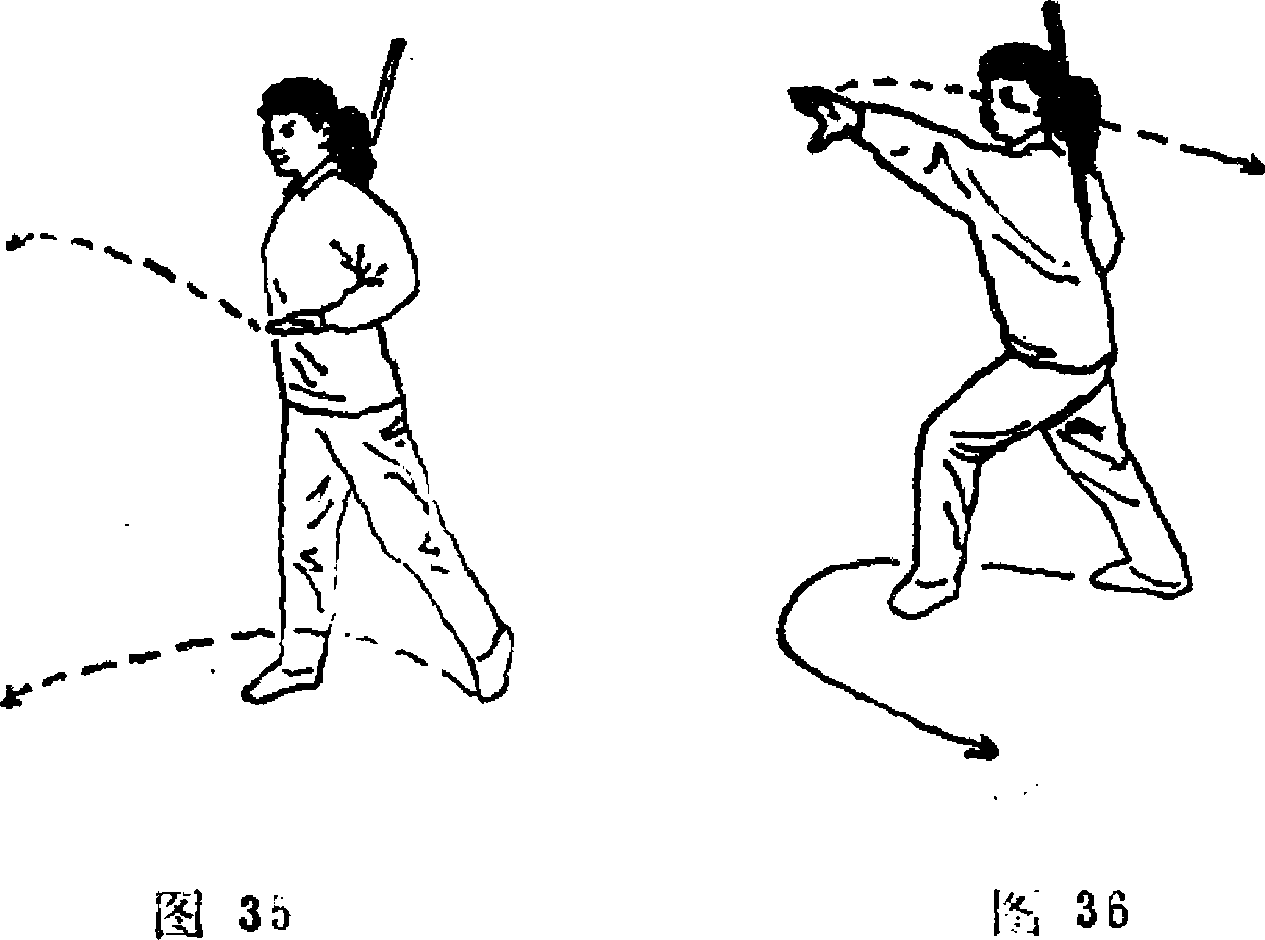 1 ?上体直起稍右转,重心前移,左腿蹬直,脚跟抬 起;右手持棍臂内旋使裩顺势经右斜下方收于背后,左手收 至腰侧,掌心向上,?目视前方(图35)。(右手持棍动作可参