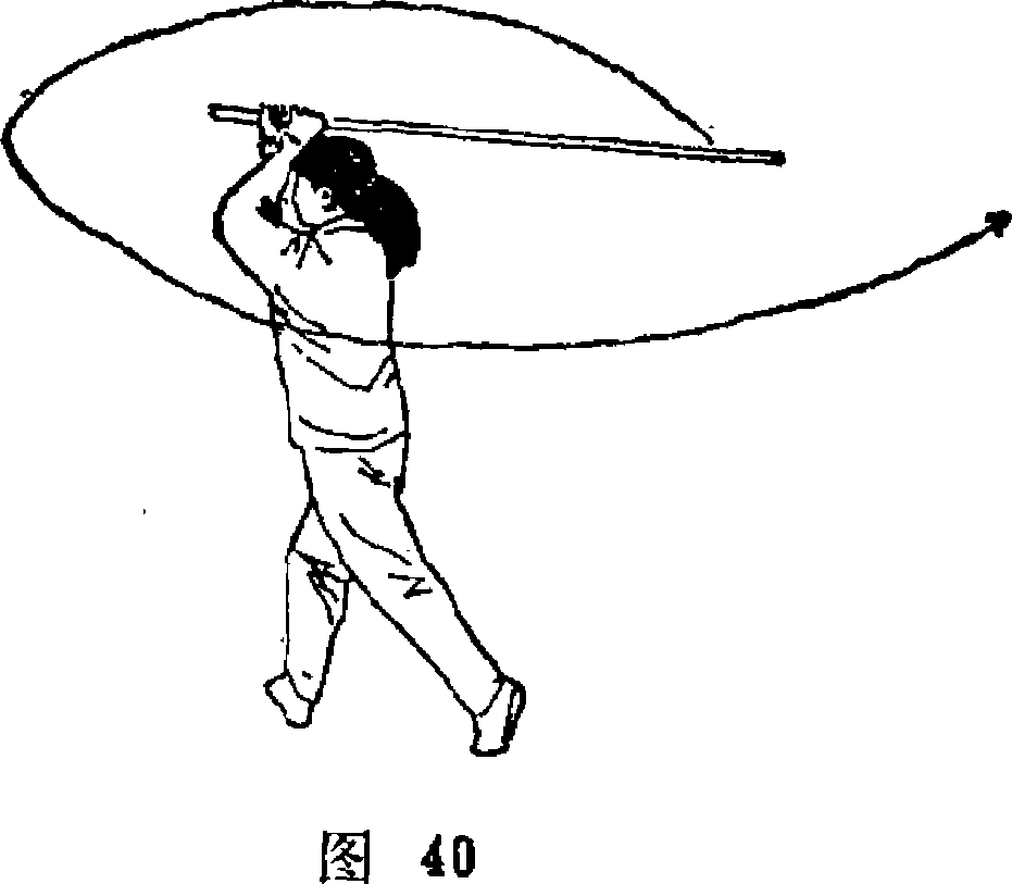 5. 右脚向前上步,两腿微屈,?右手持棍将棍把带至头- 顶上方?左手接握棍,掌外沿对右手虎口处,棍梢随之离开 背后向右、向前、向左划弧摆出,棍梢低于棍把;目视前方- (图39),
