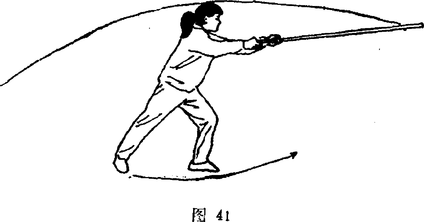 步,腿伸直,前脚掌着地;双手持棍继续向右平摆;目视棍梢 前方(图42)。