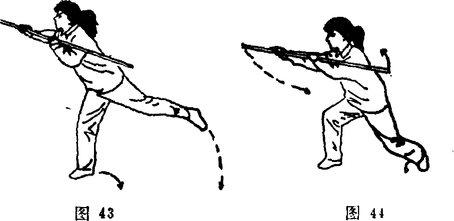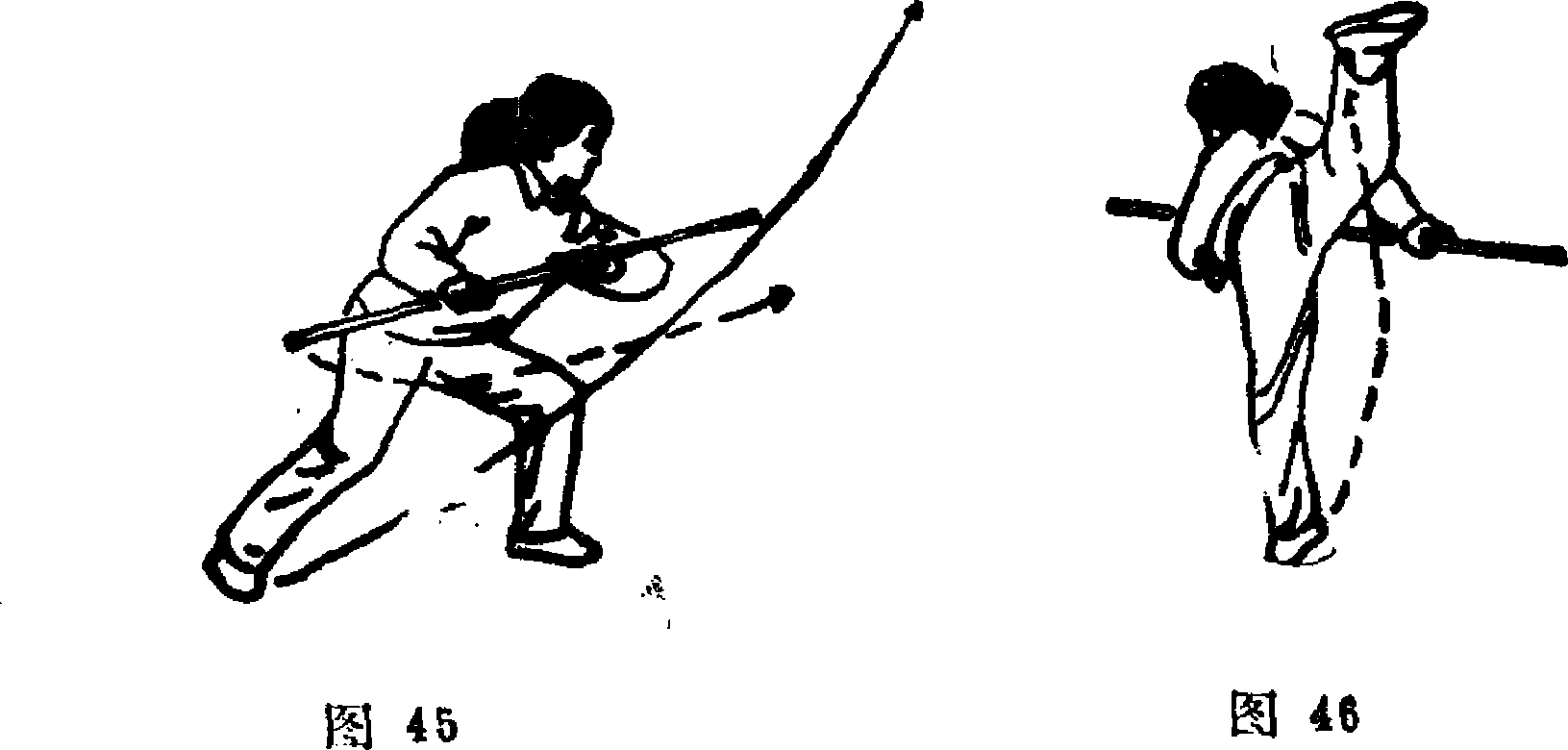 3. 上体向左拧转,重心移至左腿,右脚蹬地脚跟徵离 地;双手持棍,右手稍用力前推棍把;目视左前方(图45)。