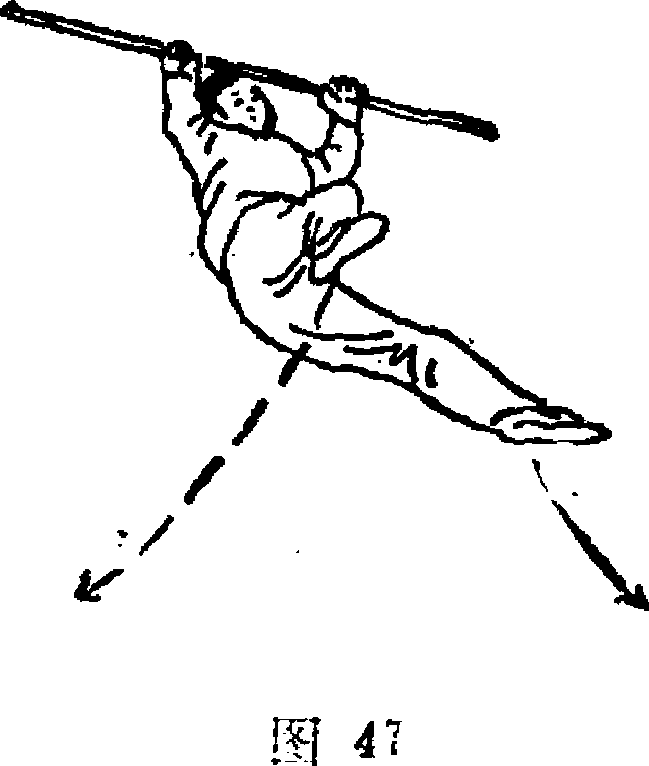 1咕靠右腿;同时身体在空中向 左迅速做水平旋转iso °,?双手 屈肘将棍抱于胸前,?向左转 头,目视左前方地面(图47) 要求:旋子转体时左腿用 力蹲地并注意迅速向右腿并 :拢,以利于转体。