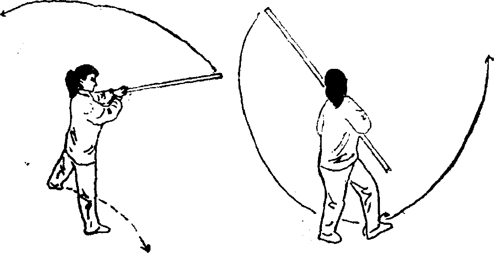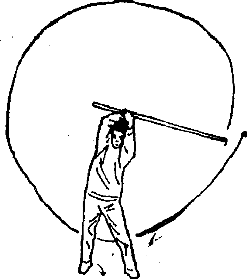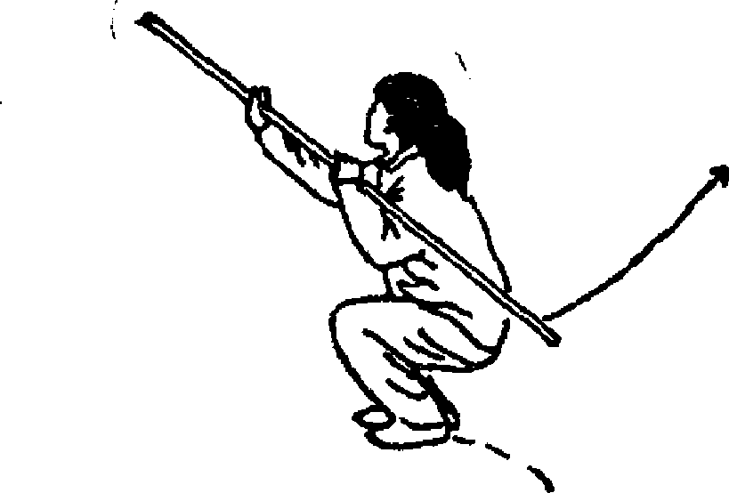 3. 两腿微腿,左脚跟外撇;双手持棍向左、向下、向i 右前方撩出,棍梢低于棍把,同时右转身;目视前方(既