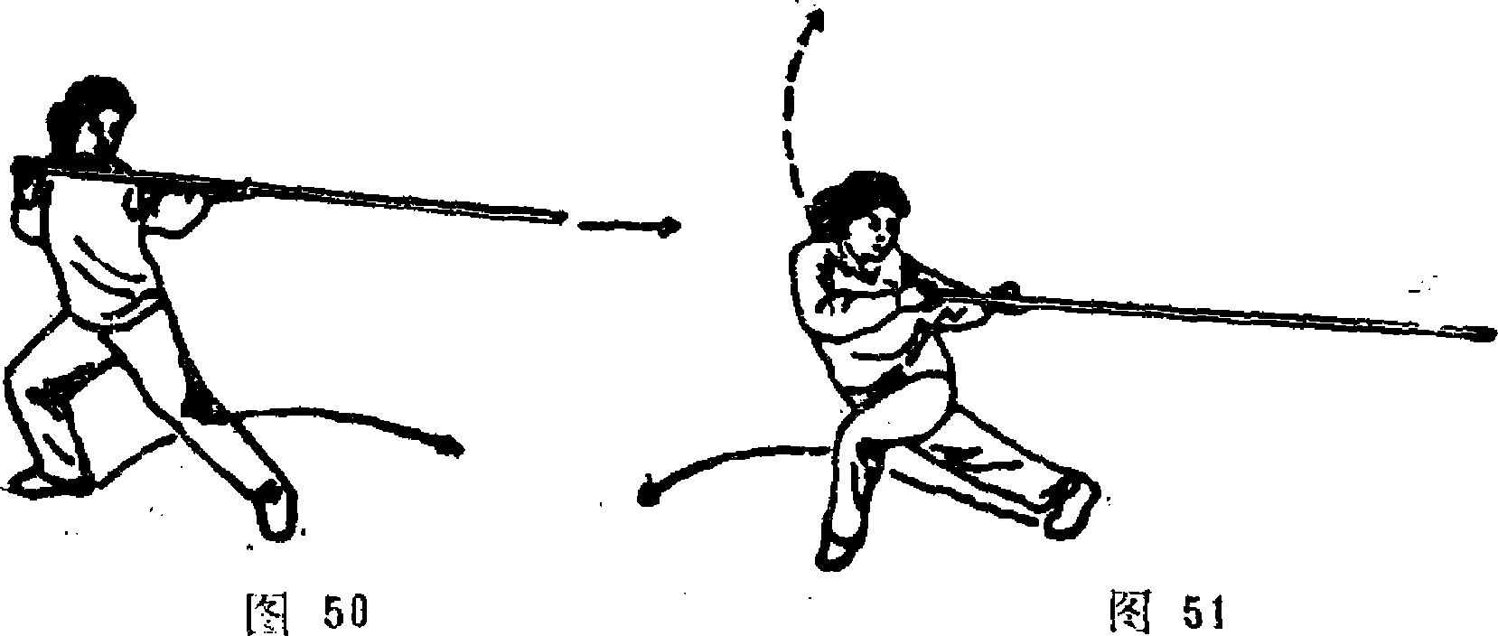 娓棍把,左手臂外旋,手心向上托棍;目视棍梢前方(图5〇)。
