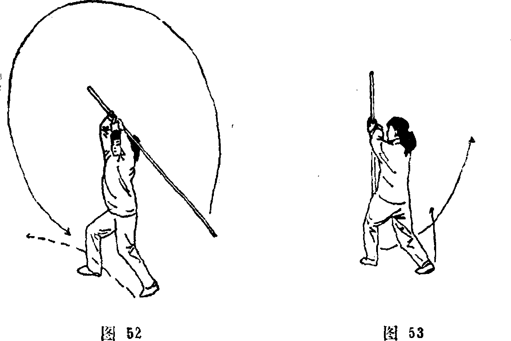 3.左脚蹬地,右腿屈膝向后上撩起,脚面绷平;双手 持棍继续向后抡举至头顶上方,棍梢低于棍把;目视前方 (图54),