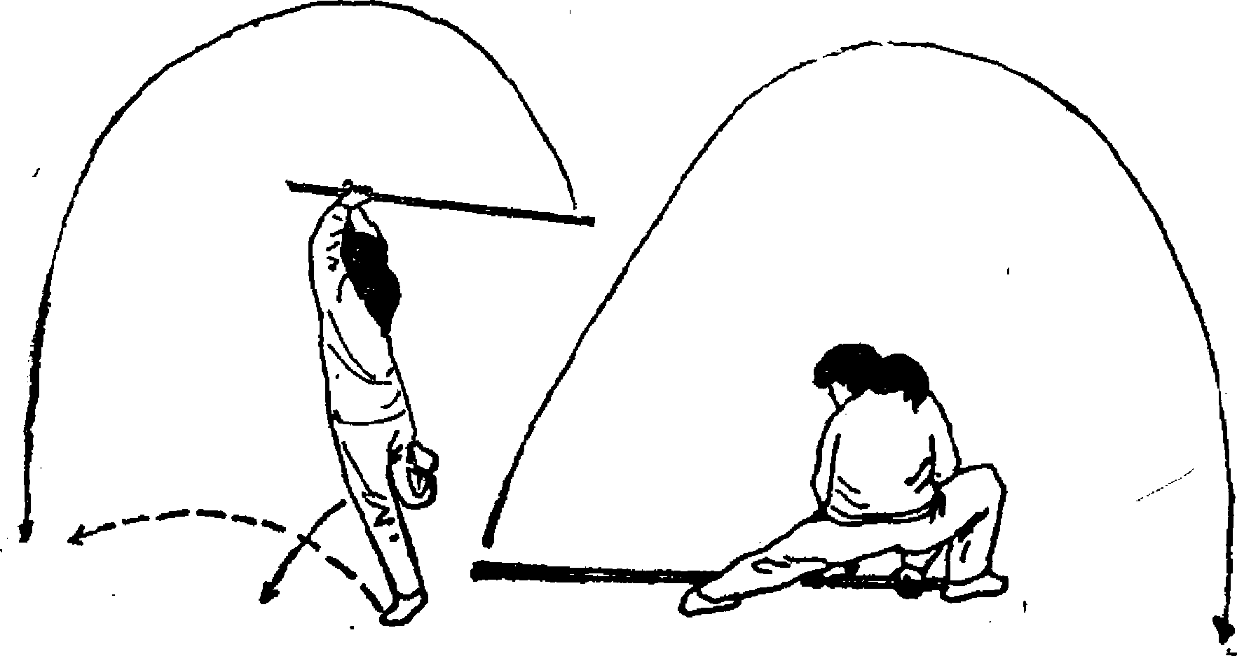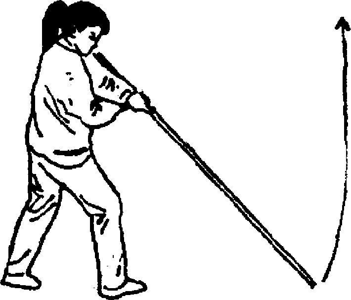 1. 右腿直立支撑,左脚向左侧抬起,腿伸直;双手持 损将棍上提.棍身水平,?目视棍梢(图57)。