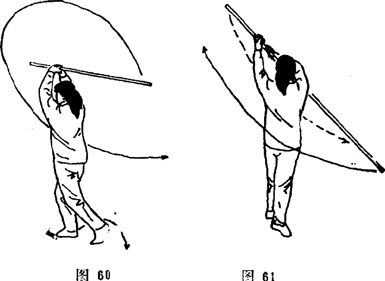 4. 身体右转,左脚抬跟起,两腿微屈;双手持棍经上 向前、向下、向后在身体右侧划立圆一周;目视前方(图 60)。