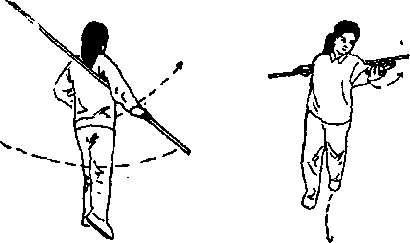 1?两腿姿势不变;右手持棍向右后方下摆棍把,左手