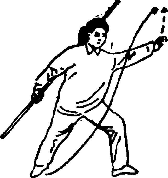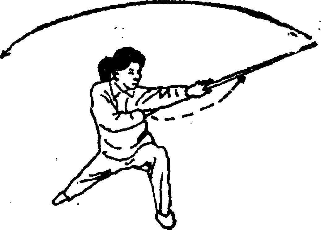 3. 身体左转180。?重心前移,左脚向左斜前方上步, 屈膝半蹲,右腿伸直成弓步;同时,双手持棍经体前向左前 方拨出,棍梢高于肩,左手滑握,右手心向上将棍后端收于