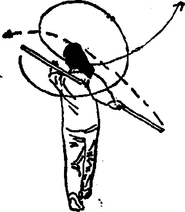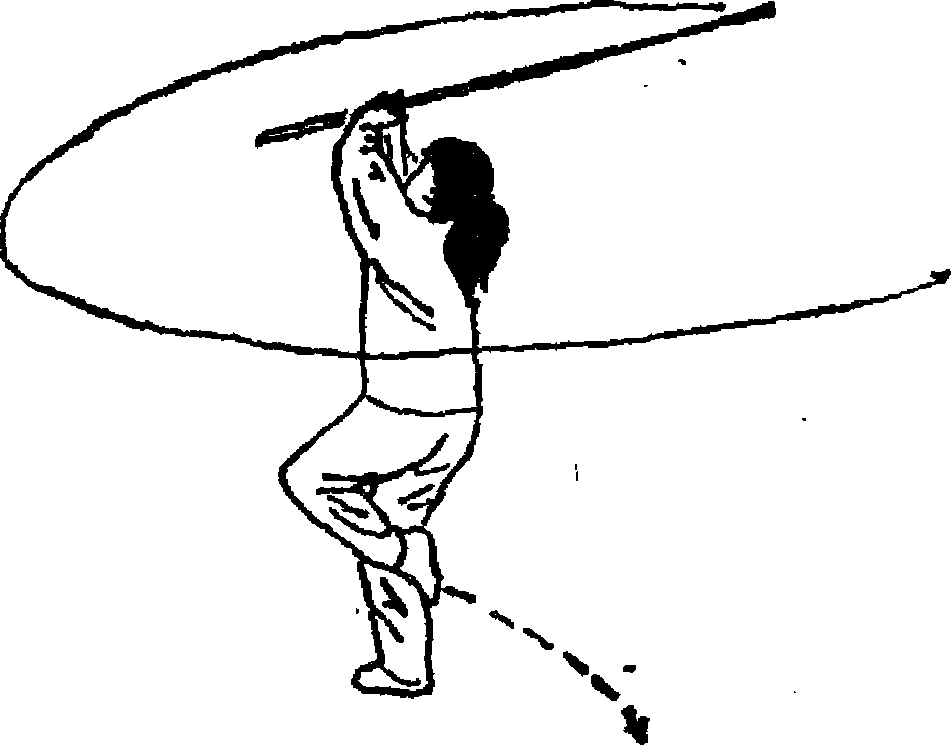 特棍将棍把带至头顶前上方,棍梢随之向右、向左?向后上 摆出,稍高于棍把,左手外沿对右手虎口接握*目视双手