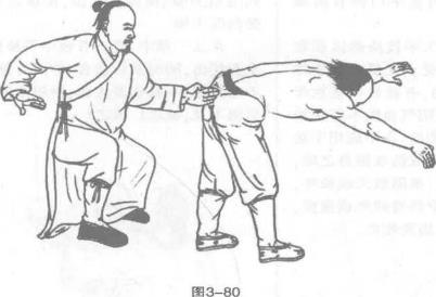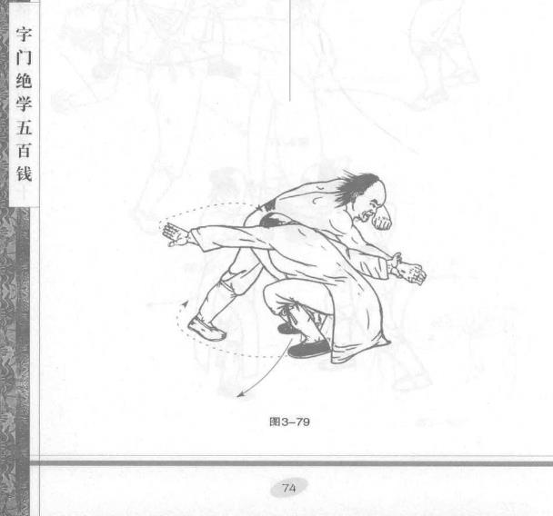 4动作不停我方左脚向敌身后上步右脚随之退步使敌方背我左掌成标手戳击敌腰后的三龙盘根穴。(图3-80)4动作不停我方左脚向敌身后上步右脚随之退步使敌方背我左掌成标手戳击敌腰后的三龙盘根穴。(图3-80)