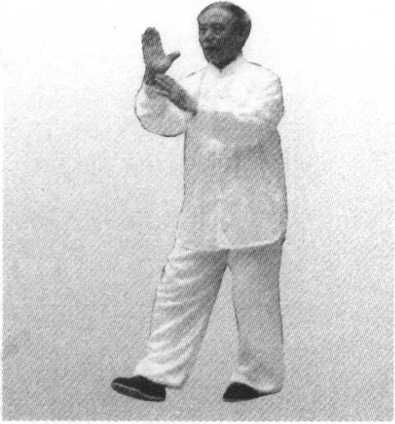 眼平,视线注视右拇指。注 意松肩、垂肘,前臂、肘上 下垂直,不可歪斜,渐变立 掌,松左胯向南运行,右肘 与右脚扬起的脚尖上下遥 对,扣右脚前掌成八字步 型,右手随。面渐向西南隅 位。身形变转,不可以腰 带,空腰以左胯变转方位。