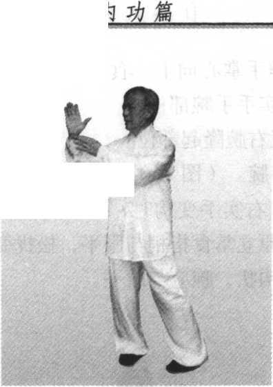 〔内功修炼〕实腿实足,虚腿虚净,空腰,按照自己对拳 艺的理解去松脚、踝、膝、胯、腰、肩、肘、腕、手等九大关 节,注意肩以下、胯以上躯干要空,每动要收小腹、空胸。