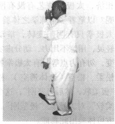 〔虚脚〕右腿虚。右腿向左,右膝虚贴左膝,脚后跟虚着 地,脚尖上扬。