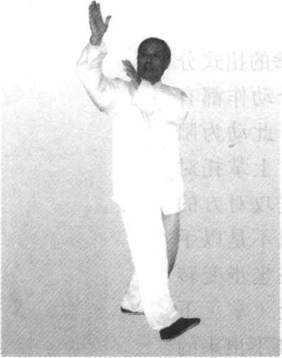 〔实手〕左掌实,拇指松,撑开虎口,侧立掌。左掌随右 腿虚渐变成为隅位弓步,向隅位上外弧舒展。