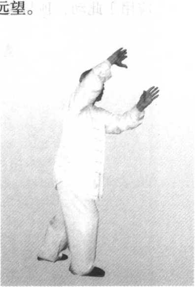 〔虚手〕右掌掌心向外,上弧立掌向上舒展,在右腿隅位 弓步和左掌舒展到位后,右掌松腕,掌心向外,虎口向下。左 右掌虎口在额头前上方遥对。