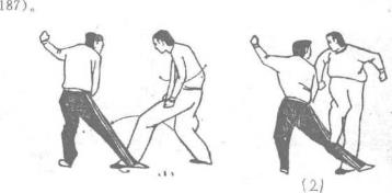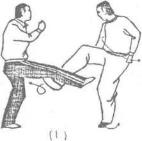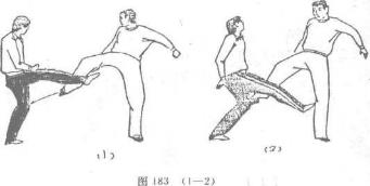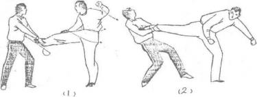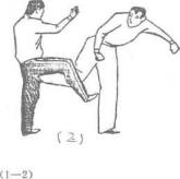 当甲跑起右脚踢乙裆部被乙双手抓住小腿时甲迅速右转,右脚向内翻转摆脱对方后随即弹蹬对方胸部(图180)图180(1—2)图180(1—2)