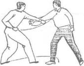 当甲右拳击向乙的面部被乙左手格挡时甲右手迅速下压乙的左手同时提起右脚向乙的胸部用力蹬踹(图182)。