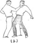 当乙右拳向甲胸部击来时甲迅速下压格挡来拳随即左脚上前一步落于乙的右脚后面脚尖内扣同时右手变掌掌心向下虎口朝前,卡住乙的颈部向后用力推压(图181)。图181图181(1—2)(1—2)
