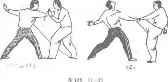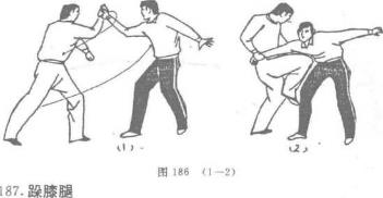 当乙右掌向甲下砸击来时甲迅速双手架挡并紧紧握住,随即起右脚向乙喉部铲去(图185)。
