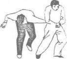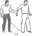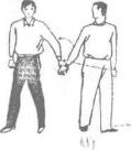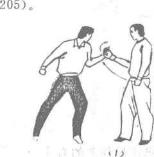 甲右手腕突然被乙在右侧用左手反手握住时甲迅速将左掌复压对立的左掌背上随将两手往腹际抽拉同时身体左转,左腿后退一步这时甲屈右臂肘关节用力下压对方肘关节随即左手上提对方腕关节,迫使对方无力反抗(图204)。
