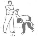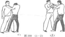 当甲被乙以右手抓住胸前时甲迅速用右手握紧对方右手腕同时左前臂上屈向下撞击对方肘关节,迫使对方剧痛而自然弯曲随即右手向前下方扭压对方手腕左手上推对方肘关节同时右手由前下方向后上方提拉致使对方前跌(图210)。