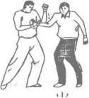 当甲不备被乙用右手(虎口向上)叉住喉部时甲迅速用右前臂或掌外侧向下猛击对方肘关节,迫使对方剧痛而自然弯曲,此时甲乘机上体前倾贴近对方