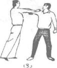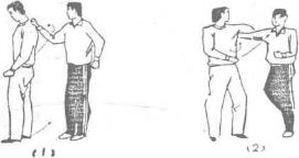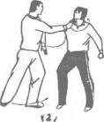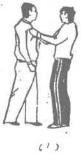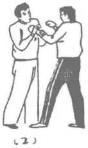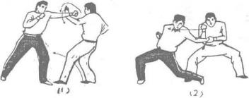 甲被乙双手抓住前襟用力上提时甲迅速右手四指在上封握对方左腕关节上部,右手由对方两臂之间穿上握住对方左腕关节内侧并紧贴于胸前,随即右腿后撤身体向前、下、右扭转使对方剧痛而受制(图211)。