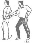 当甲的后腰部被乙右手抓住时甲身体迅速左后转左前臂随身体的旋力横击对方右前臂同时右臂揽抱对方颈部左手抓住对方的右上臂身体上前贴近对方右腿插到对方后脚