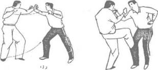 当乙用左直拳击甲的面部时甲以左手向外格挡随即迅速翻腕抓住乙的左手腕并向内向左转拉,同时右脚向前一步用膝关节抵住乙的左腿胭窝用右前臂砸压乙的左前臂(图214)