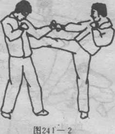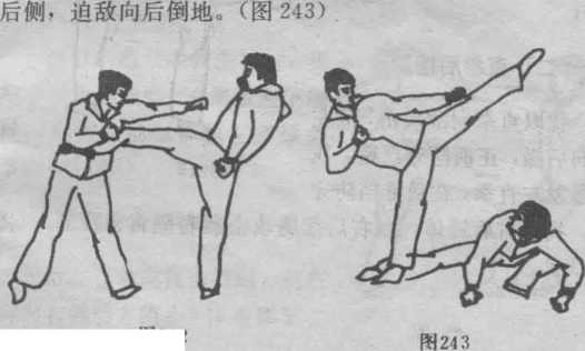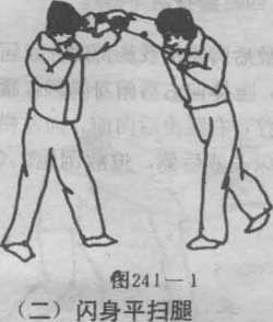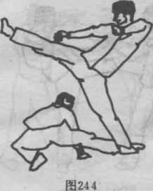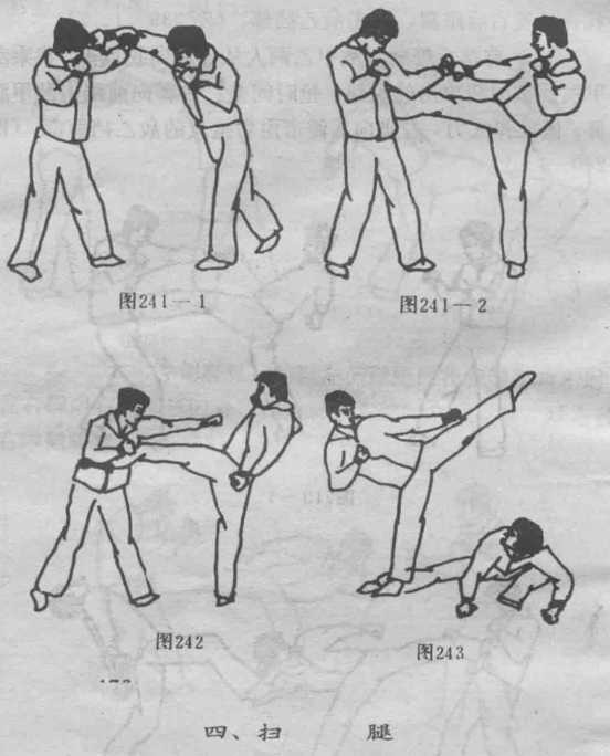 我左、右摆拳两次击打敌头部敌屈臂格挡防守时我乘其中盘露空突然起右脚猛向左拧腰发右平扫腿猛踢敌左侧助部。(图241—1、2)敌以左直拳向我头部击打时我右脚向右跨步随之闪身。左髓向右拧突然发左平扫腿猛踢敌下腹部。(图242)(=)蹲身前下扫腿敌以左外摆腿向我头、胸部踢来时我迅速曲膝蹲身右胯猛向左拧右脚由下方向前、向左、向后猛扫敌右踝关节图242图242图242图242(四)俯身后下扫腿敌后脚侧踹我胸部时我屈膝蹲身上体向右后俯身躲闪腰向右后拧右腿由后向前、向左横扫敌右踝关节后侧迫敌倒地。(图244)
