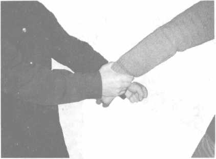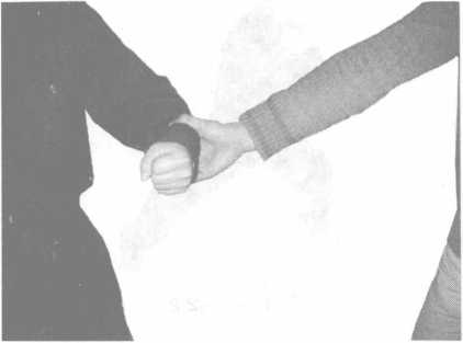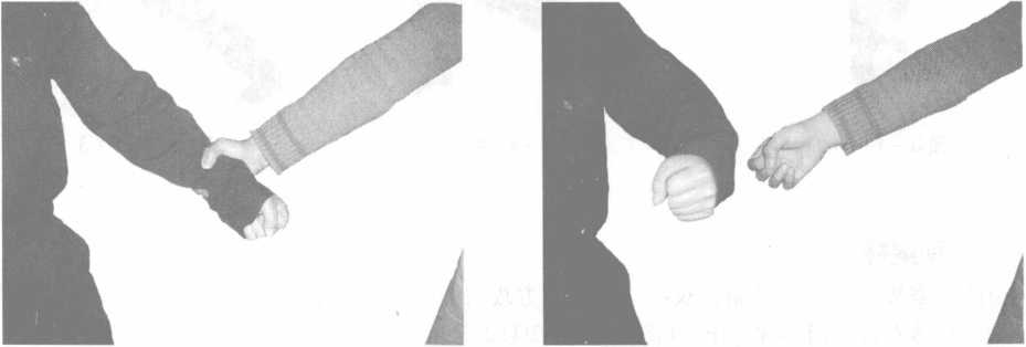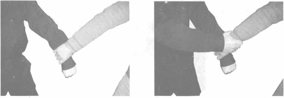 左手腕被对方左手正抓握右手向上拍打对方手腕同时左臂内旋下压即可解脱(图3-5