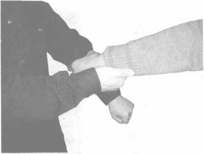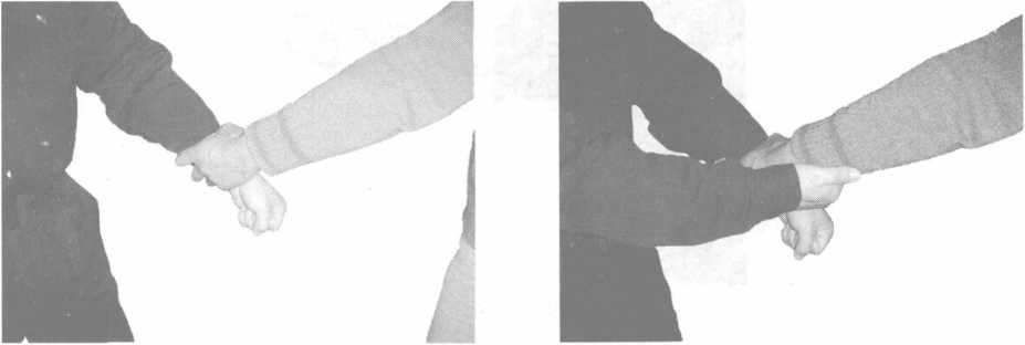 左手腕被对方右手正抓握左臂内旋屈肘即可解脱(图3-5-1123)。要点左臂内旋与屈肘要连贯、有力要从对方的虎口处进行挣脱。