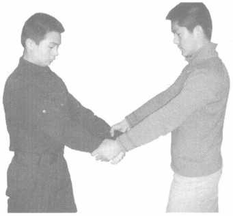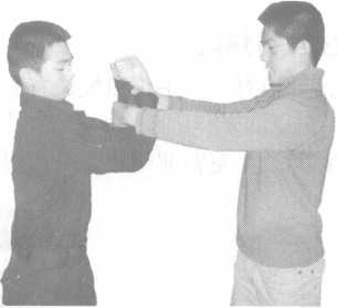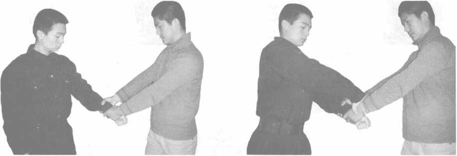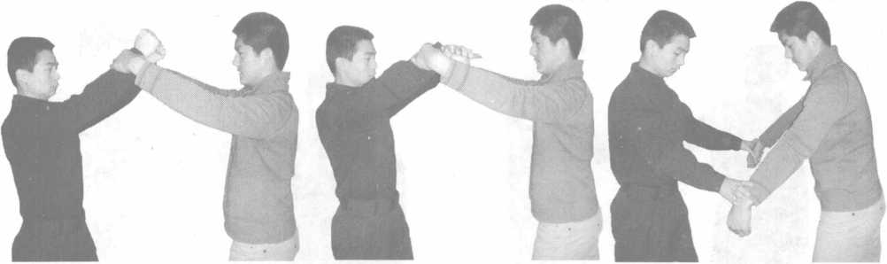 当对方双手缠切我右手腕时。身体下蹲右臂屈肘左手抓握对方左手腕随后左手上提右手侧带身体直立即可解脱。(图3-5-101234)