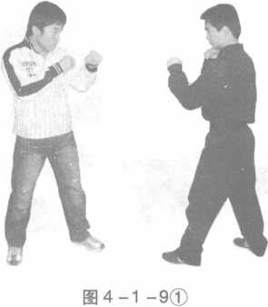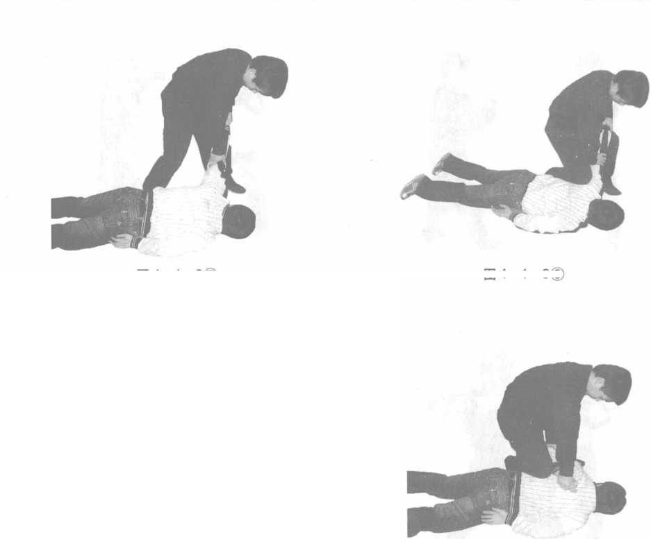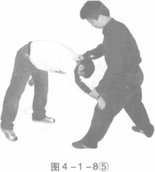 双方站立侵害方前手左直拳攻击己方左反抓握随即上右步顶肘随后右手击打侵害方后腰进行别摔倒地后右膝顶肩右手压肘左手压腕于己方腿部。(图4-1-912345678)或拧臂控制。(图4-1-91234567附8附)