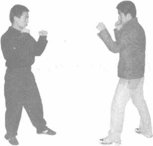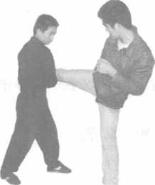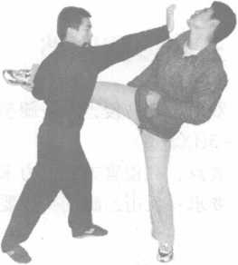 双方站立侵害方右腿横击己方进步左臂外挂防守随即推掌反击侵害方面部。(图4-21123)要点在对方横击力未全发时外挂。要求进步要快与外挂要协调。图4-2-113图4-2-12图4-2-13
