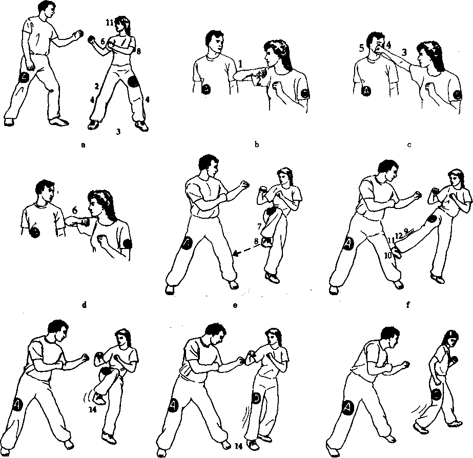 请你老师或受过训练的监督员根据上述的各项重点对你的背后反击技术进行评估。首先单个地完成几种荻术然后将它们结合起来使用。譬如将顶肘和甩头结合踢腿、刮小腿和踩脚背相结合以及本章中所列出的其他方法结合。练习时,力度和速度只要求达到正常状态的34即可。为了更好地掌握这门技术将控制身体的平衡和目标的瞄准作为训练的另一重点。