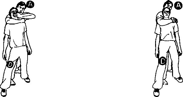 这种抱袭通常分为两种第一种是攻击者用一手臂环住对方的喉部而另一只手臂扼住对方尖叫或者抓住你的上臂(见图45)第二种是攻击者用非环抱的手抓住另一只手的手腕(见图45),这使攻击者的攻击更加坚不可摧施加在防守者脖子上的压力更大。实际上回击这两种攻击的技术是相同的只是不牢固的抱取更容易反击脱身。防守动作主要包括通过将其手臂下拉来减弱脖子上的压力然后使用正确的背后反击技术例如推肘和后踢。