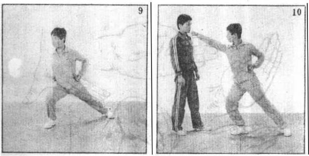 1 直拳由弓步双抱拳开始(图9)拳出腰际小臂向内旋转拳心向下以拳面击打(图10)。用于击打胸、面、肋等部位。