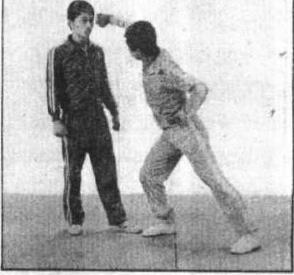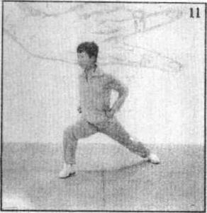 2 摆拳由弓步双抱拳开始(图11),拳出腰际臂由体侧向前摆出拳心向外以拳面击打(图12)。用于击打太阳穴等部位。