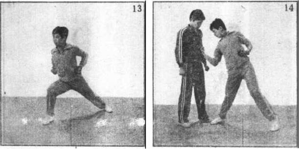 3 勾拳由弓步抱拳开始(图13),拳出腰际屈肘、腕拳心向内由下向上以拳面击打(图14)。用于打下颌、腹腔等部位。