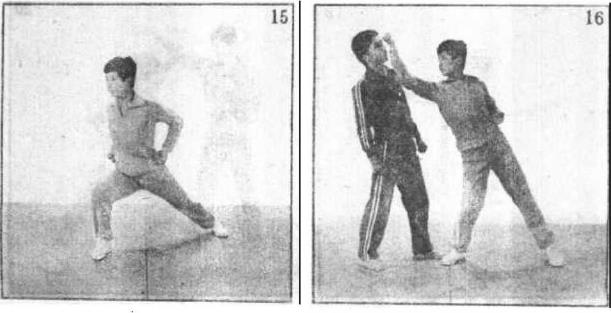 4 砸拳由弓步双抱拳开始(图15),臂上举拳心朝上由上向下以拳背击打(图16)。用于击头、面等部位。
